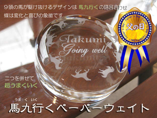 商品説明: 内容量315ml・高さ90mm・口径85mm・底径60mmの丈夫な口部強化ガラス製のグラスです。 九頭の馬と、変化と喜びの象徴である蝶を組み合わせ「超うまくいく」の語呂合わせになる縁起のいい商品です。 GoingWell(うまくいく)の文字とお名前を彫刻いたします。 世界に1つだけの幸運を呼ぶマイグラスをオーダーメイドでお作りいたします。