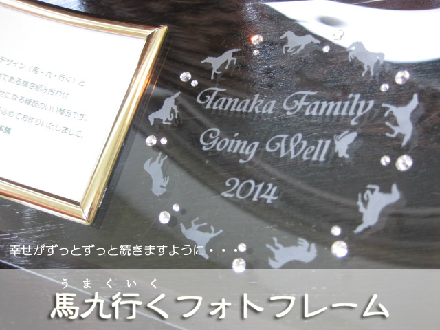 商品説明: ●290mm×150mmのガラス製フォトフレームです。 (アクリススタンド付き) ●九頭の馬と、変化と喜びの象徴である蝶を組み合わせ「超うまくいく」の語呂合わせになる縁起のいい商品です。 GoingWell(うまくいく)の文字とお名前を彫刻いたします。