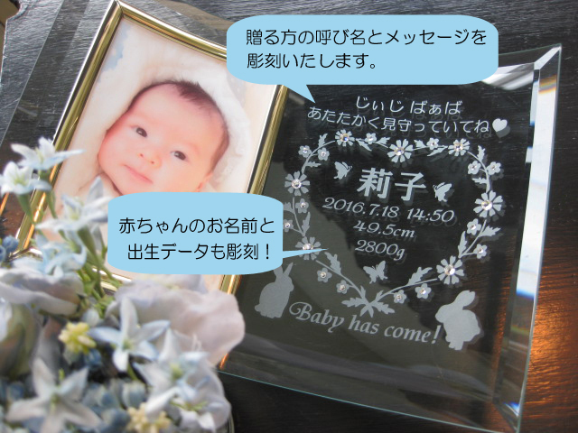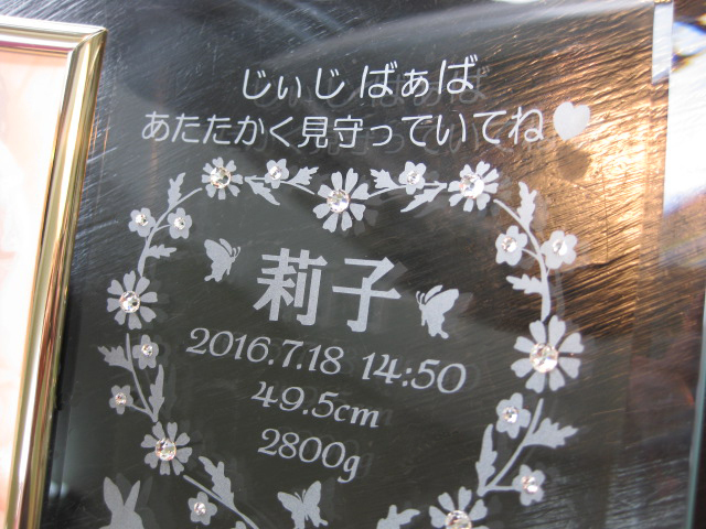 赤ちゃんのお名前はもちろん、出生日時や出生時の身長・体重まで彫刻いたします。